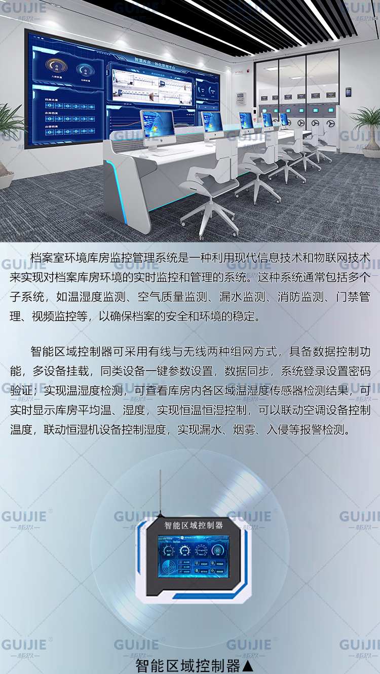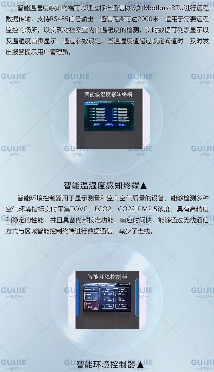 系统概述: 档案库房安全保护综合智能管理系统是按照国家档案局《档案馆建筑设计规范》、《档案馆温湿度管理暂行规定》、《档案库房技术管理暂行条例》等有关档案安全保护的管理技术要求设计完成,突出了档案库房档案安全保护的“八防”(即防高温、防潮湿、防盗、防火、防霉菌、防光、防尘、防虫等)要求,实现了档案库房安全保护由被动人工管理向现代化、智能